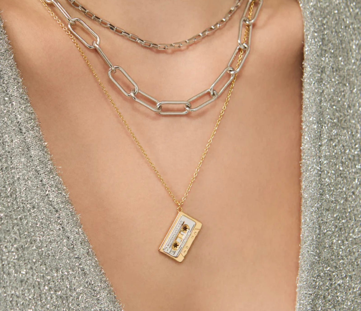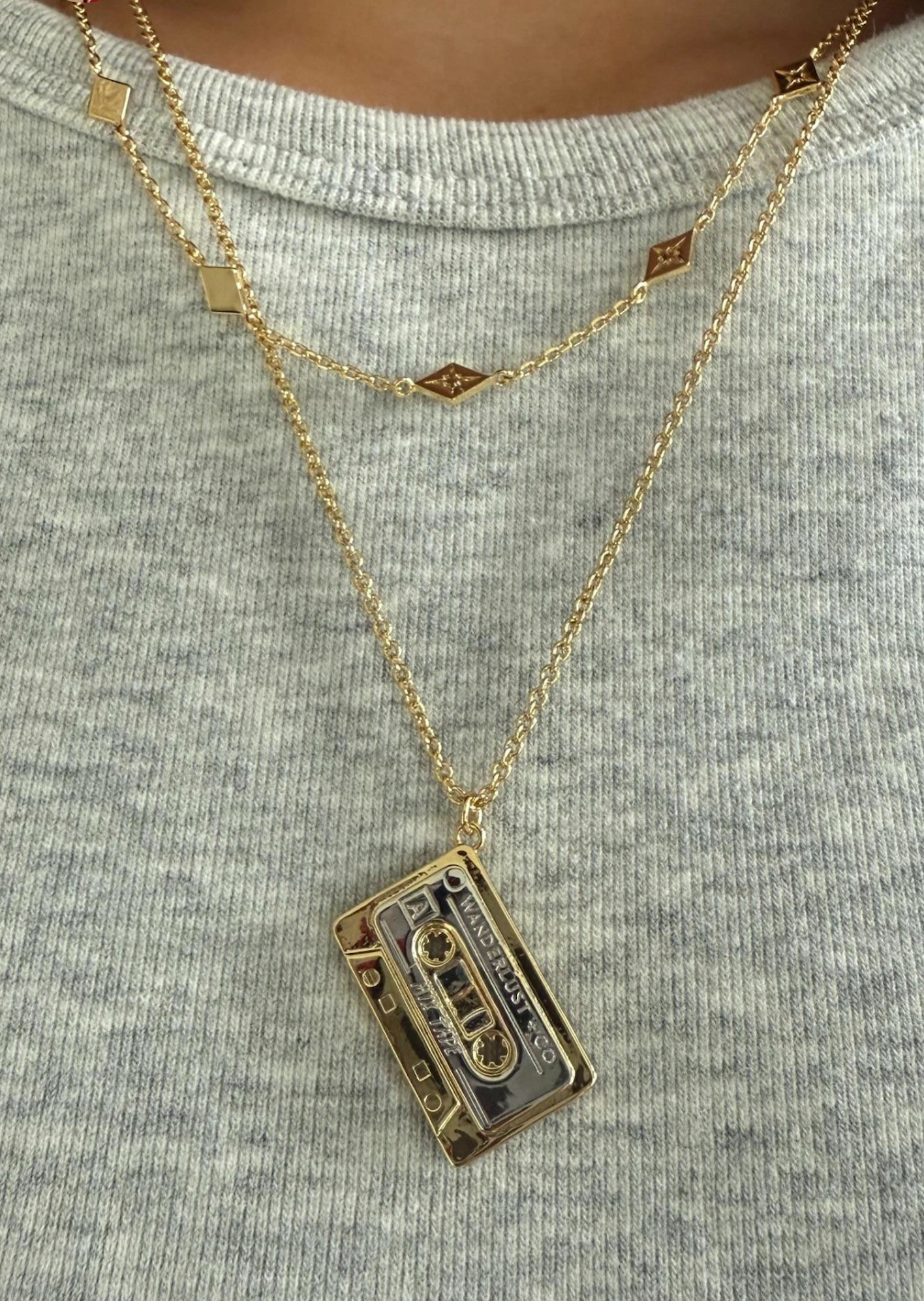 We’re hitting rewind with our Cassette Necklace. Crafted in stunning gold, this necklace features a mini cassette charm, complete with intricate details reminiscent of those tiny spools that held your favorite jams. Wear this as a reminder of the good ol' days when you'd wind up the tape with a pencil, eagerly waiting to hit play.