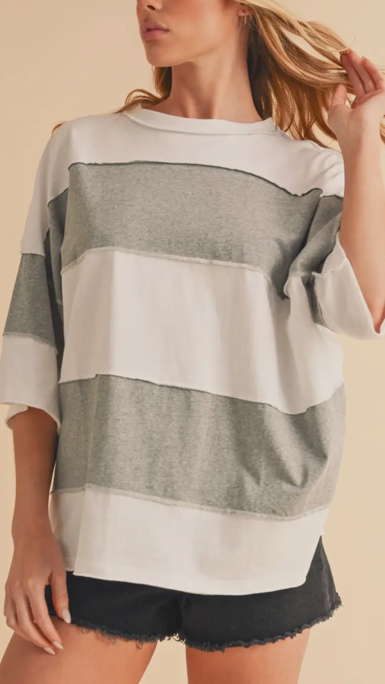 This relaxed-fit T-shirt features heathered grey and white stripes with exposed seams for a casual, effortless vibe. Its oversized silhouette and breezy style make it perfect for pairing with denim or leggings.